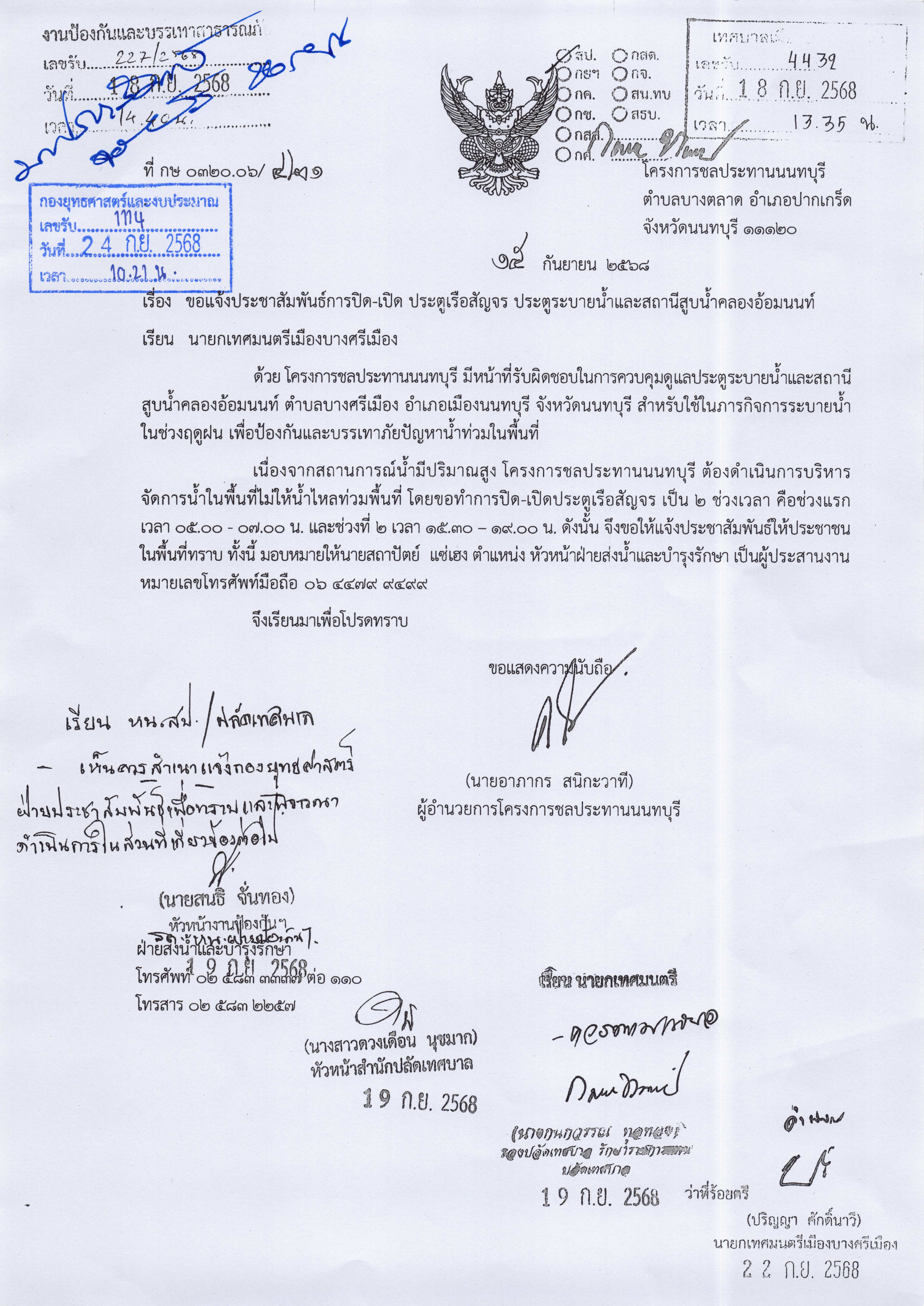 โครงการชลประทานนนทบุรี ขอแจ้งประชาสัมพันธ์การปิด-เปิด ประตูเรือสัญจร ประตูระบายน้ำและสถานีสูบน้ำคลองอ้อมนนท์ เป็นเวลา 2 ช่วงเวลา คือช่วงแรก เวลา 05.00 - 07.00 น. และช่วงที่ 2 เวลา 15.30 - 19.00 น. รายละเอียดตามเอกสารด้านล่างนี้