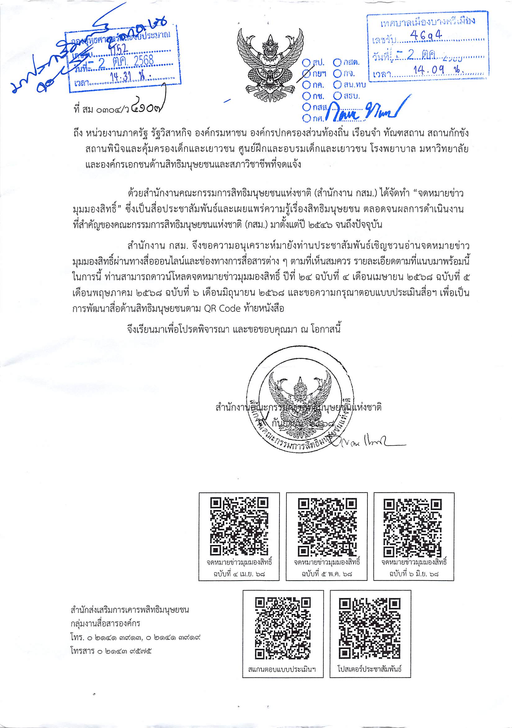 สำนักงาน กสม. ขอรปะชาสัมพันธ์เชิญชวนอ่านจดหมายข่าวมุมมองสิทธิ์ผ่านทางสื่อออนไลน์ โดยสามารถดาวน์โหลดจดหมายข่าวมุมมองสิทธิ์ ปีที่ 24 ฉบับที่ 4 เดือนเมษายน 2568 ฉบับที่ 5 เดือนพฤษภาคม 2568 ฉบับที่ 6 เดือนมิถุนายน 2568 รายละเอียดตาม QR Code