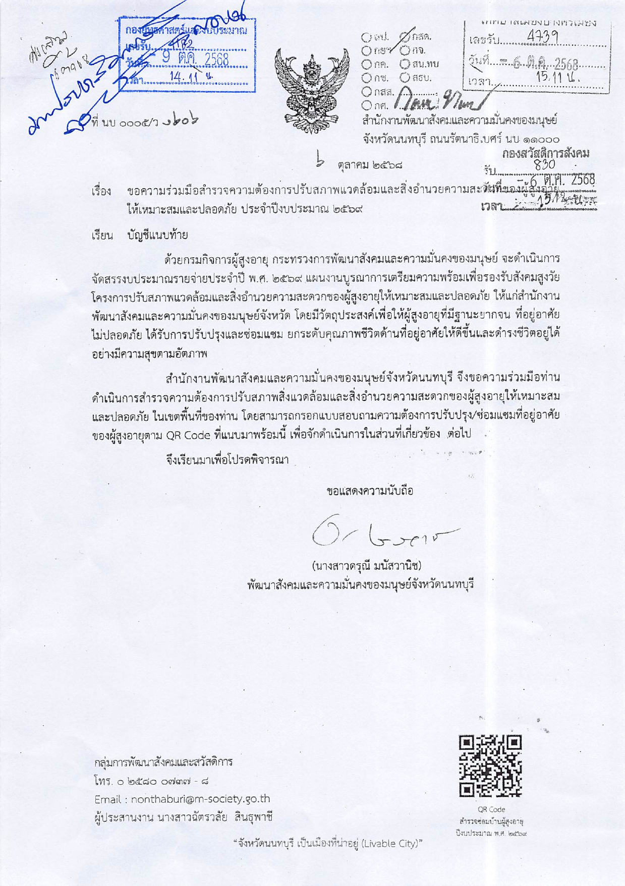 สำนักงานพัฒนาสังคมและความมั่นคงของมนุษย์จังหวัดนนทบุรี ประชาสัมพันธ์สำรวจความต้องการปรับสภาพสิ่งแวดล้อมและสิ่งอำนวยความสะดวกของผู้สูงอายุให้เหมาะสมและปลอดภัย ประจำปีงบประมาณ 2569 โดยสามารถกรอกแบบสอบถามความต้องการปรับปรุง/ซ่อมแซมที่อยู่อาศัยของผู้สูงอายุตาม QR Code ด้านล่างนี้
