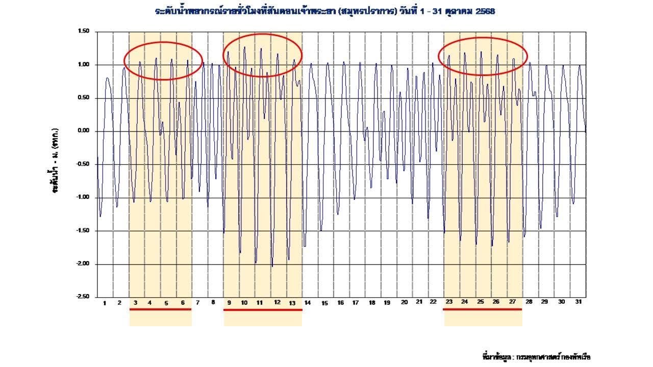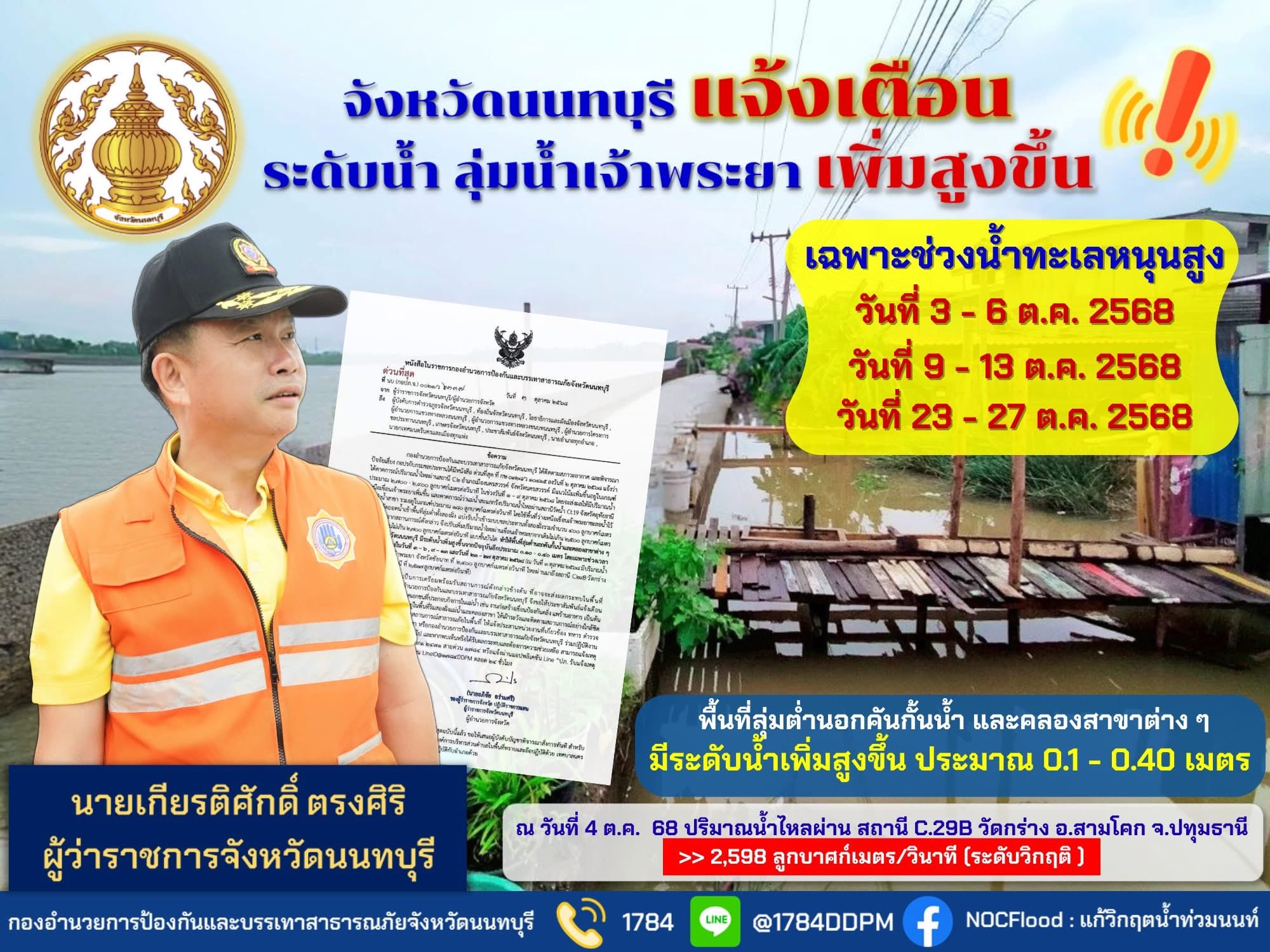 พิจารณาปัจจัยเสี่ยง กอปรกับกรมชลประทาน แจ้งว่าได้คาดการณ์ปริมาณน้ำไหลผ่านสถานี C.2 อำเภอเมืองนครสวรรค์ จังหวัดนครสวรรค์ มีแนวโน้มเพิ่มขึ้นอยู่ในเกณฑ์ประมาณ 2,700 - 2,90 ลูกบาศก์เมตรต่อวินาที ในช่วงวันที่ 1 - 9 ตุลาคม 2568 โดยจะส่งผลให้มีปริมาณน้ำเหนือเขื่อนเจ้าพระยาเพิ่มขึ้น และคาดการณ์ว่าแม่น้ำสะแกกรังปริมาณน้ำไหลผ่านสถานีวัดน้ำ Ct.19 จังหวัดอุทัยธานี และลำน้ำสาขา รวมอยู่ในเกณฑ์ประมาณ 180 ลูกบาศก์เมตรต่อวินาที โดยใช้พื้นที่ว่างเหนือเขื่อนเจ้าพระยาชะลอน้ำไว้รวมทั้งตัดยอดน้ำเข้าพื้นที่ลุ่มต่ำทั้งสองฝั่ง แบ่่งรับน้ำเข้าระบบชลประทานทั้งสองฝั่งรวมจำนวน 400 ลูกบาศก์เมตรต่อวินาที จากสถานการณ์ดังกล่าว จึงปรับเพิ่มปริมาณน้ำไหลผ่านเขื่อนเจ้าพระยาจากเดิมไม่เกิน 2,500 ลูกบาศก์เมตรต่อวินาที เป็นไม่เกิน 2,700 ลูกบาศก์เมตรต่อวินาที แบบขั้นบันได ทำให้พื้นที่ลุ่มต่ำนอกคันกั้นน้ำและคลองสาขาต่าง ๆ ในพื้นที่จังหวัดนนทบุรี มีระดับน้ำเพิ่มสูงขึ้นจากปัจจุบันอีกประมาณ 0.10 - 0.40 เมตร โดยเฉพาะช่วงเวลาน้ำทะเลหนุนสูงในวันที่ 3 - 6 , 9 - 13 และวันที่ 23- 27 ตุลาคม 2568 ( ณ วันที่ 3 ตุลาคม 2568 มีปริมาณน้ำไหลผ่านเขื่อนเจ้าพระยา จังหวัดชัยนาท ที่ 2,400 ลูกบาศก์เมตรต่อวินาที ไหลผ่านมาถึงสถานี C29B วัดกร่าง อ.สามโคก จ.ปทุมธานี ที่ 2,517 ลูกบาศก์เมตรต่อวินาที)