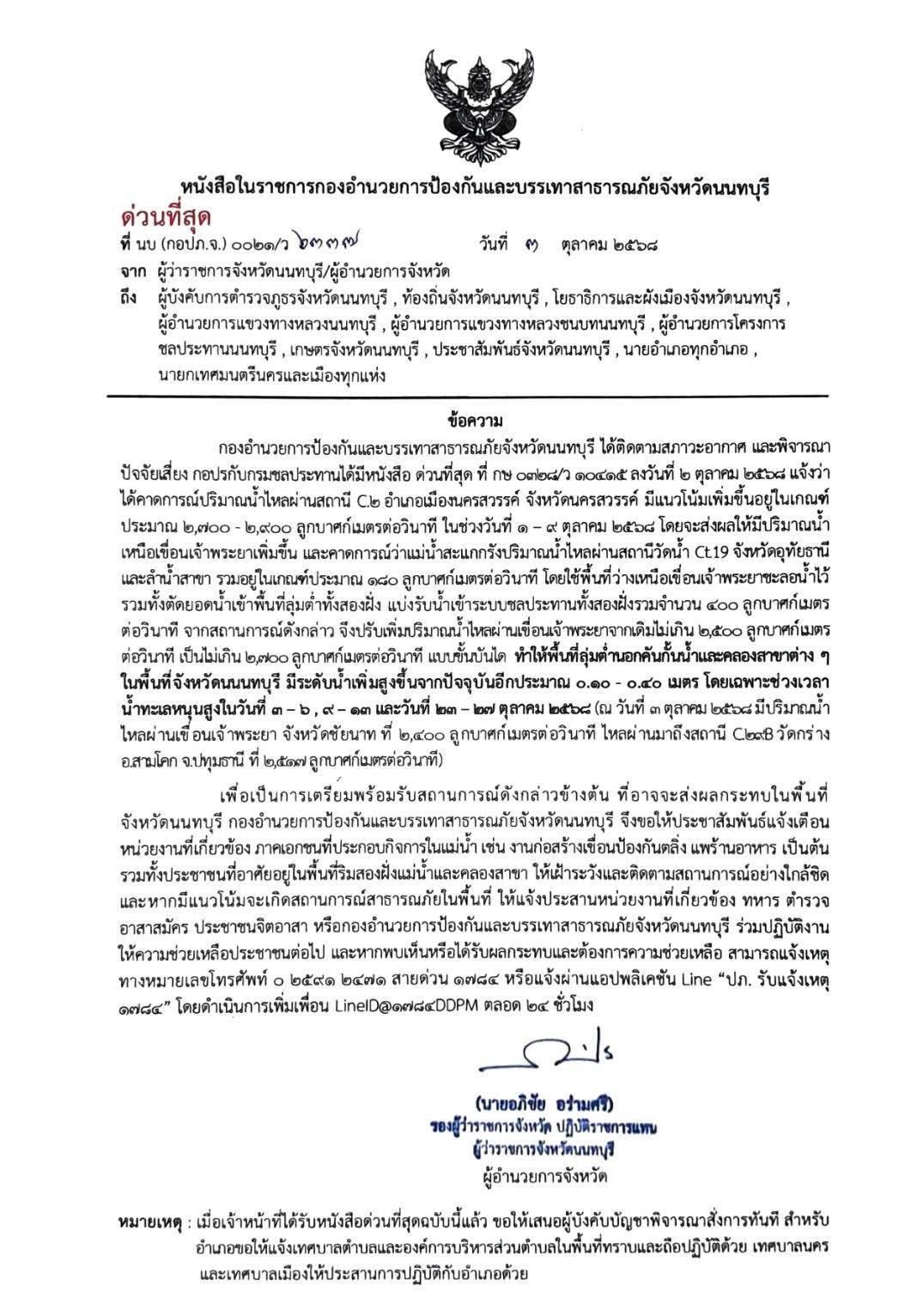 หนังสือในราชการกองอำนวยการป้องกันและบรรเทาสาธารณภัยจังหวัดนนทบุรี ด่วนที่สุด ที่ นบ (กอปภ.จ.) 0021/ว 6337 ลงวันที่ 3 ตุลาคม 2568