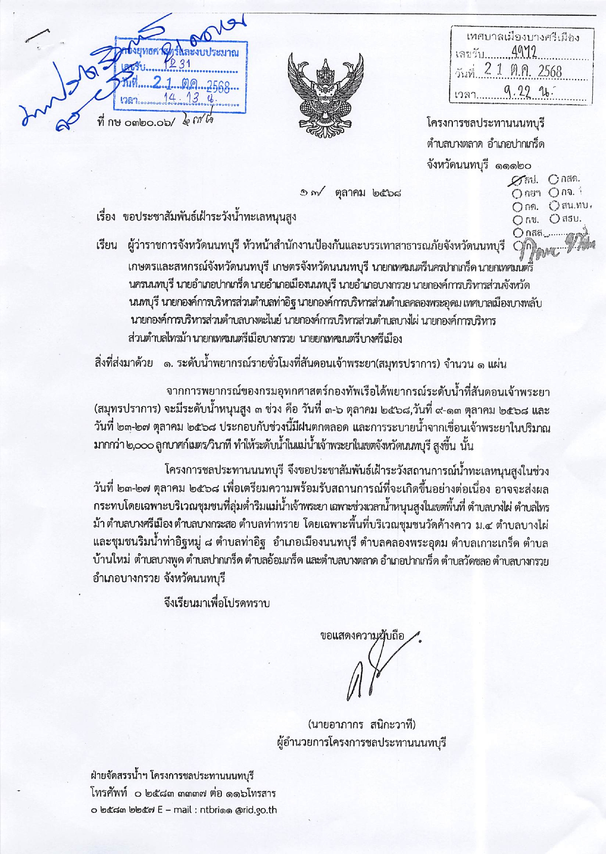 โครงการชลประทานนนทบุรี แจ้งประชาสัมพันธ์เฝ้าระวังน้ำทะเลหนุนสูง รายละเอียดตามเอกสารด้านล่างนี้