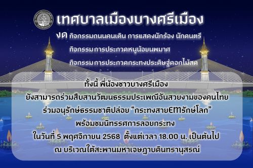 เทศบาลเมืองบางศรีเมือง  ร่วมสืบสานวัฒนธรรมประเพณีลอยกระทง ขอเชิญชาวบางศรีเมืองร่วมอนุรักษ์ธรรมชาติปล่อย "กระทงสายEMรักษ์โลก" พร้อมชมนิทรรศการลอยกระทง
