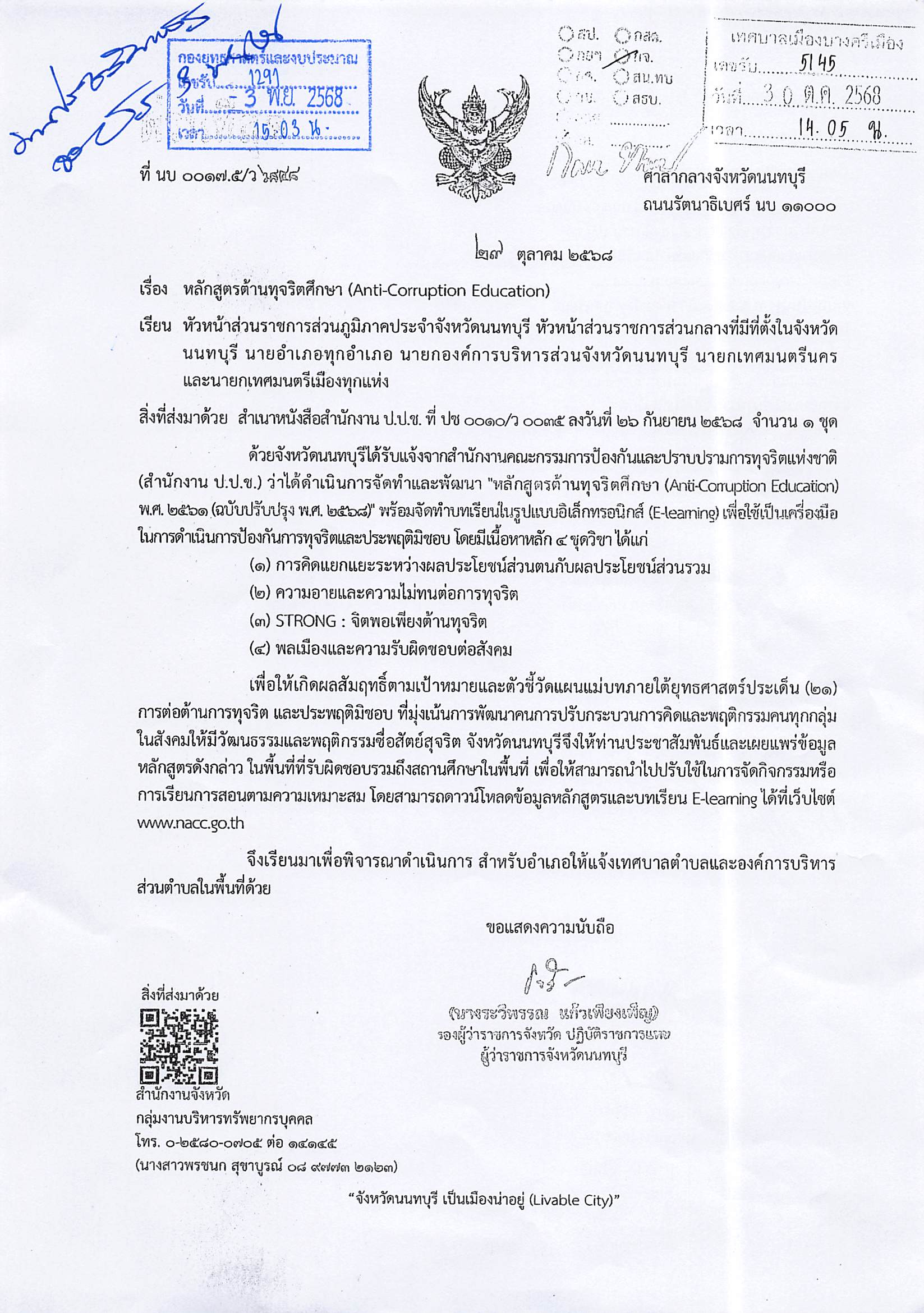 จังหวัดนนทบุรีแจ้งประชาสัมพันธ์หลักสูตรทุจริตศึกษา โดยสามารถดาวน์โหลดข้อมูลหลักสูตรและบทเรียน E-learning ได้ที่เว็บไซต์ www.nacc.go.th