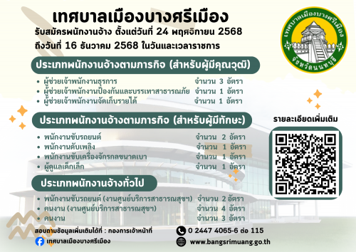 เทศบาลเมืองบางศรีเมือง รับสมัครพนักงานจ้าง ตั้งแต่วันที่ 24 พฤศจิกายน 2568 ถึงวันที่ 16 ธันวาคม 2568 ในวันและเวลาราชการ ประเภทพนักงานจ้างตามภารกิจ (สำหรับผู้มีคุณวุฒิ)