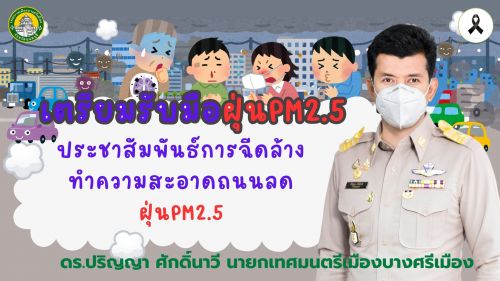 ดร.ปริญญา ศักดิ์นาวี นายกเทศมนตรีเมืองบางศรีเมือง ได้มอบหมายให้เจ้าหน้าที่งานป้องกันและบรรเทาสาธารณภัย ดำเนินการฉีดล้างพ่นละอองน้ำในพื้นที่เบื้องต้น เพื่อช่วยลดปริมาณฝุ่นละอองในอากาศ