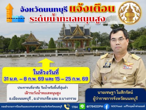กรมอุทกศาสตร์ กองทัพเรือ ได้พยากรณ์สภาวะระดับน้ำในแม่น้ำเจ้าพระยาบริเวณกองบัญชาการกองทัพเรือ ป้อมพระจุลจอมเกล้า จังหวัดสมุทรปราการ โดยคาดหมายว่ามีระดับน้ำหนุนสูง ส่งผลให้เกิดสภาวะระดับน้ำล้นตลิ่ง และระดับน้ำในแม่น้ำ/คลองเพิ่มสูงขึ้น อาจไหลเข้าท่วมบริเวณพื้นที่ลุ่มต่ำริมแม่น้ำ/คลอง ได้แก่ ิอำเภอเมืองนนทบุรี อำเภอปากเกร็ด และอำเภอบางกรวย รวมถึงชุมชนนอกแนวคันกั้นน้ำและแนวเขื่อนชั่วคราวบริเวณที่ไม่มีแนวป้องกันน้ำถาวร (แนวฟันหลอ) ระหว่างวันที่ 31 มกราคม - 8 กุมภาพันธ์ 2569 และระหว่างวันที่ 15 - 25 กุมภาพันธ์ 2569