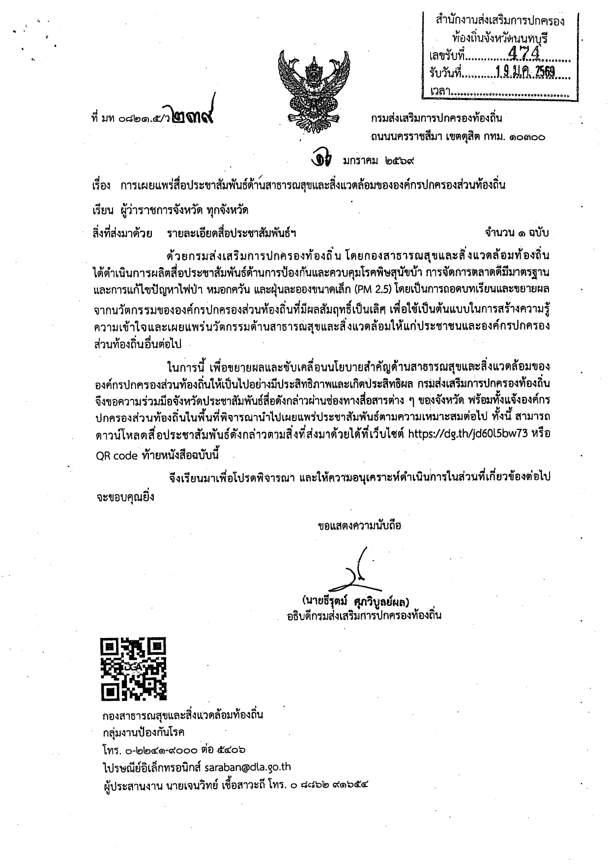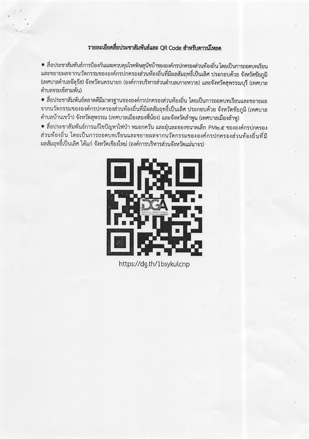 กองสาธารณสุขและสิ่งแวดล้อมท้องถิ่น ได้ดำเนินการผลิตสื่อประชาสัมพันธ์ด้านการป้องกันและควบคุมโรคพิษสุนัขบ้า การจัดการตลาดดีมีมาตรฐาน และการแก้ไขปัญหาไฟป่า หมอกควัน และฝุ่นละอองขนาดเล็ก (PM2.5) เพื่อใช้เป็นต้นแบบในการสร้างความรู้ ความเข้าใจและเผยแพร่นวัตกรรมด้านสาธารณสุขและสิ่งแวดล้อมให้แก่ประชาชนและองค์กรปกครองส่วนท้องถิ่น รายละเอียดตามเอกสารด้านล่างนี้