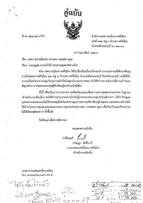เรียนท่านผู้แจ้งเรื่อง วัยรุ่นนั่งมั่วสุม ซ.บางศรีเมือง24 (วัดป่าเรไร) นั้นทางเทศบาลฯได้แจ้งหน่วยงานที่เกียวข้องทราบแล้ว ผลเป็นประการใดจะแจ้งให้ทราบ ต่อไป