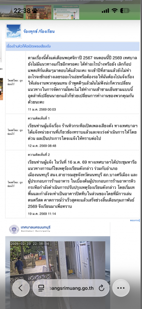 ไม่ทราบว่าเทศบาลได้ติดตามเรื่องต่อจากที่ทางร้านได้แจ้งว่าจะปรับปรุงแล้วหรือยังคะ จะสิ้นเดือนกุมภาแล้วยังเปิดเพลงเสียงดังอยู่เลยไม่ทราบว่าร้านนั้นได้ดำ |
